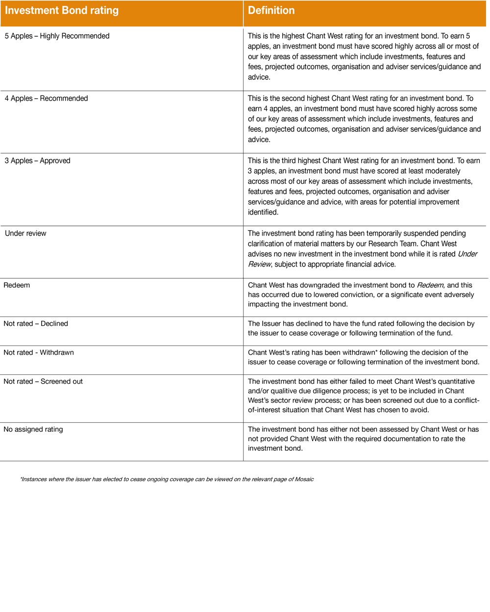 The table below summarises the ratings definitions for the new investment option ratings terminology. Our ratings are based on information that is either publicly available or is provided directly to us by the investment bond providers themselves.