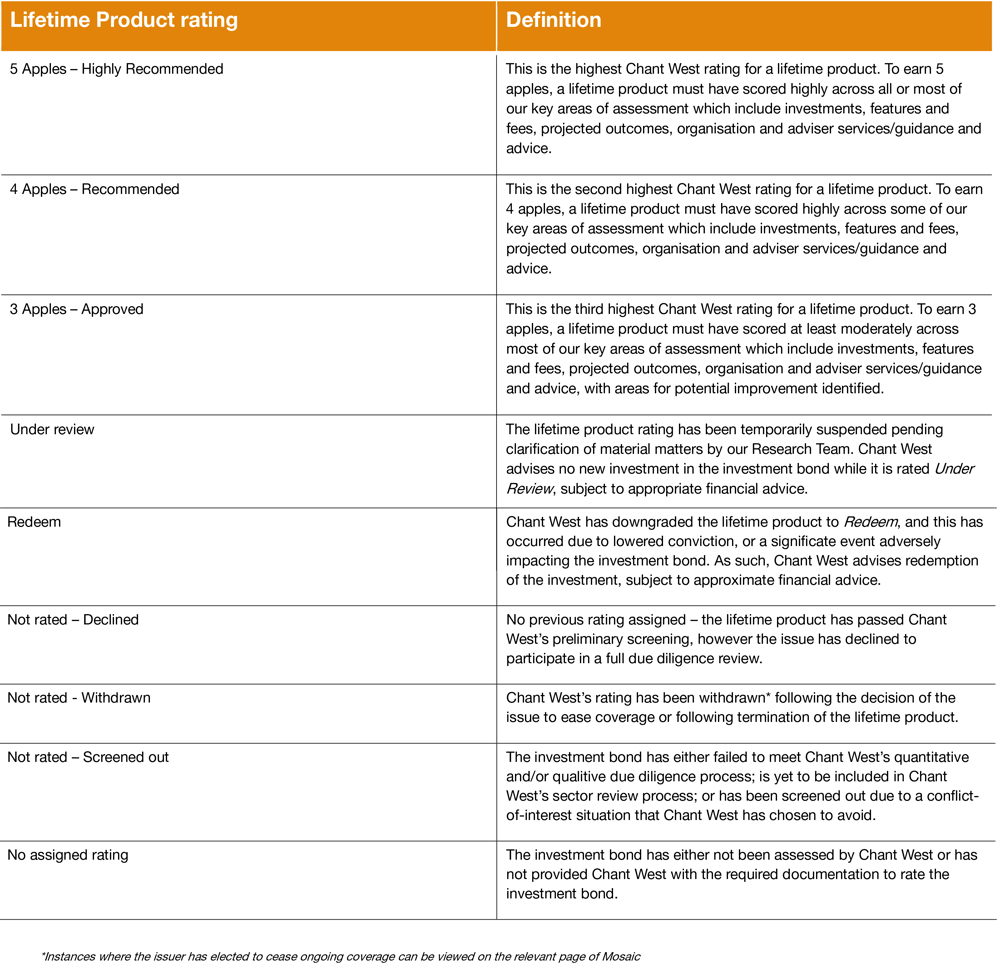 The table below summarises the ratings definitions provided for lifetime product. Our ratings are based on information that is either publicly available or is provided directly to us by the lifetime product providers themselves.