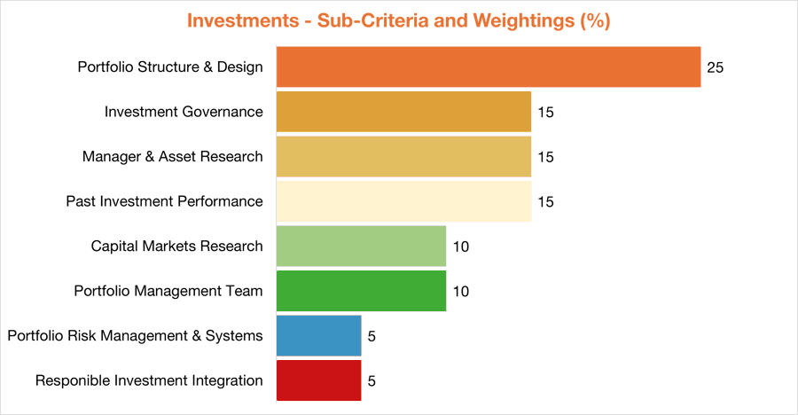Investments are obviously important and account for 45% of our overall rating for pension members. When we rate a fund's investments, we do not focus on past returns. Rather, we focus on assessing the quality of the fund's investment governance, its in-house investment team, its external asset consultant (particularly for research), and the structure of its investment portfolios. If it does these things well, it is likely to have strong, long-term performance.