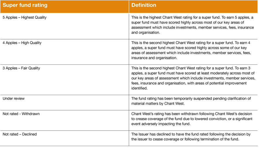 Disclaimer: ©Zenith CW Pty Ltd ABN 20 639 121 403 (Chant West), Authorised Representative of Zenith Investment Partners Pty Ltd ABN 27 103 132 672, AFSL 226872 under AFS Representative Number 1280401, 2023. This website is only intended for use by Australian residents and is subject to use in accordance with Chant West’s Terms of Use and should be read with Chant West’s Financial Services Guide. Products, reports, ratings (Information) are based on data which may be sourced from a third party and may not contain all the information required to evaluate the nominated product providers, you are responsible for obtaining further information as required. To the extent that any Information provided is advice, it is General Advice (s766B Corporations Act). Individuals should seek their own independent financial advice and consider the appropriateness of any financial product in light of their own circumstances and needs before making any investment decision. Chant West has not taken into account the objectives, financial situation or needs of any specific person who may access or use the Information provided including target markets of financial products, where applicable. It is not a specific recommendation to purchase, sell or hold any product(s) and is subject to change at any time without prior notice. Individuals should consider the appropriateness of any advice in light of their own objectives, financial situations or needs and should obtain a copy of and consider any relevant PDS or offer document before making any decision. Information is provided in good faith and is believed to be accurate, however, no representation, warranty or undertaking is provided in relation to the accuracy or completeness of the Information. Information provided is subject to copyright and may not be reproduced, modified or distributed without the consent of the copyright owner. Except for any liability which cannot be excluded, Chant West does not accept any liability whether direct or indirect, arising from use of the Information. Past performance is not an indication of future performance. Chant West ratings and research are prepared by Chant West and are not connected in any way to research and ratings prepared by any of our related entities.