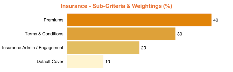 The main aspects we focus on are the premiums, the conditions that must be met for benefits to be paid, the amount of cover available without medical evidence and the range and relevance of the benefits provided. Insurance accounts for 12.5% of the overall rating and is shown in the chart below.