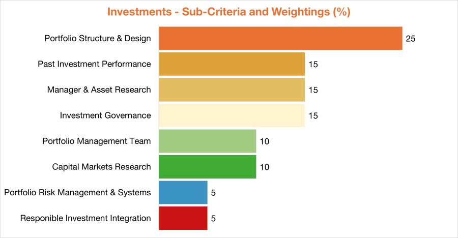 Investments are obviously important and account for 45% of our overall rating. When we rate a fund's investments, we assess the quality of the fund's investment governance, its in-house investment team, how it works with its external asset consultant (particularly for research), and the structure of its investment portfolios. If it does these things well, it is likely to have strong, long-term performance.