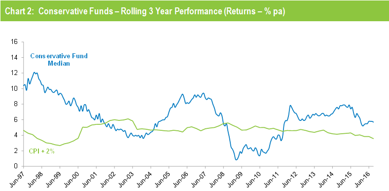 Chart 2 compares the performance of the lower risk Conservative category (21 to 40% growth assets) median with its typical objective of CPI plus 2% per annum over rolling three year periods. It shows that Conservative funds have also exceeded their objective in recent years.
