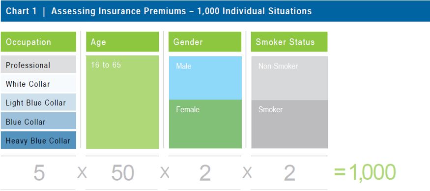 Insurance is also highly complex. As shown in Chart 1, a typical premium table will cover as many as 1,000 individual situations relating to the member's occupation, age, gender and smoker status.